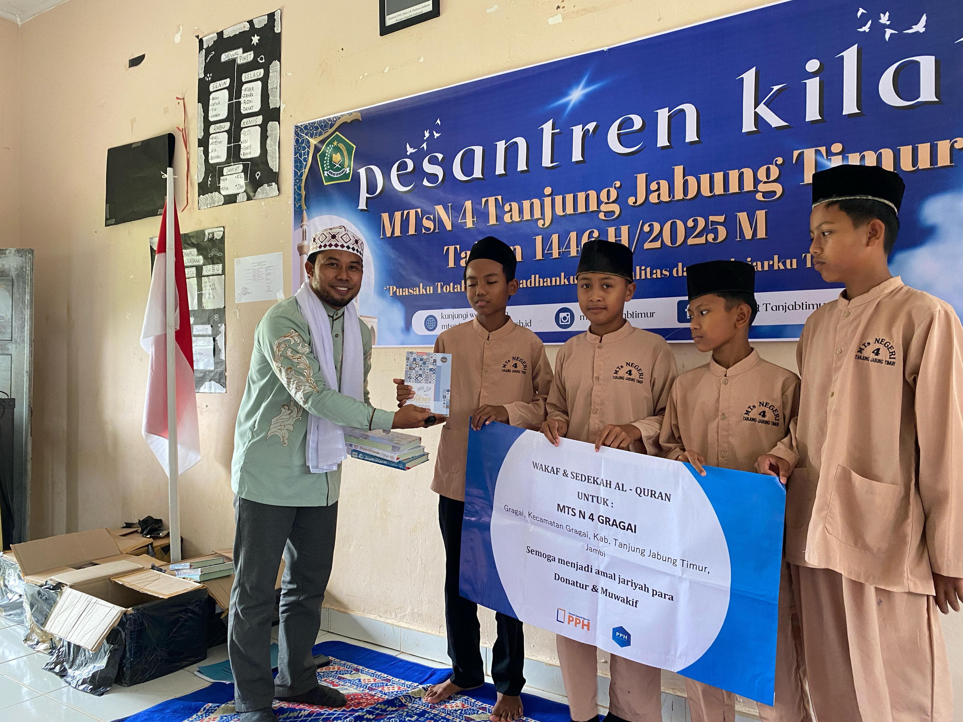 Dalam rangka mendukung program pendidikan Agama, MTsN 4 Tanjung Jabung Timur menerima donasi Al-Qur'an melalui wakaf dan sedekah yang diberikan oleh para donatur dan muwakif. Kegiatan ini berlangsung dengan acara Pesantren Kilat di mana sebanyak 183 Al-Qur'an dibagikan kepada seluruh siswa/i MTsN 4 sebagai upaya untuk mempermudah mereka dalam mempelajari isi kitab suci Al-Qur'an.