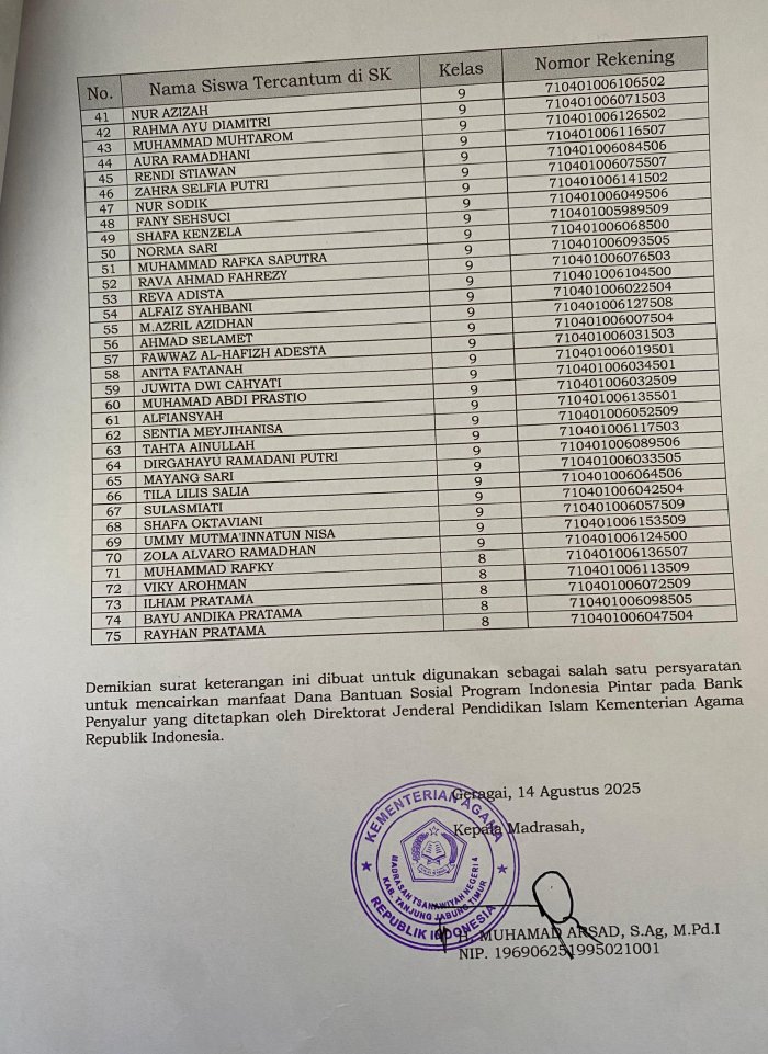 Sebanyak 75 siswa MTsN 4 Tanjung Jabung Timur menerima bantuan dari Program Indonesia Pintar (PIP) pada 14 Agustus 2025. Bantuan ini diberikan sebagai bentuk dukungan pemerintah untuk membantu keberlangsungan pendidikan siswa, terutama dalam meringankan biaya sekolah dan kebutuhan belajar sehari-hari.