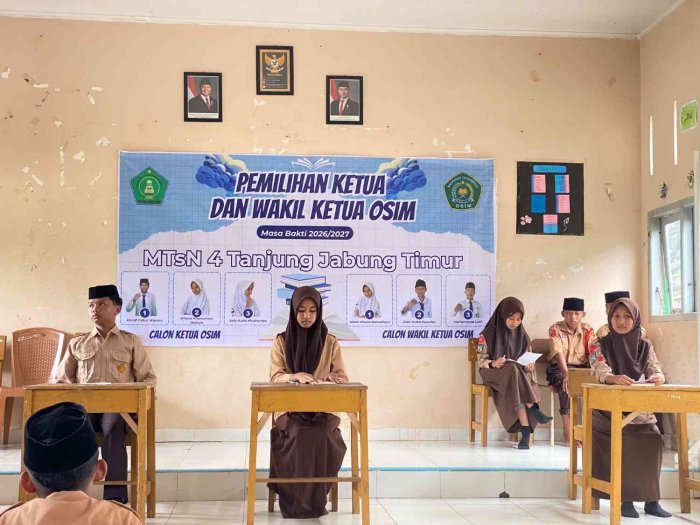 Debat calon Ketua dan Wakil Ketua OSIM di MTsN 4 Tanjung Jabung Timur berlangsung dengan penuh semangat dan antusiasme. Kegiatan ini merupakan bagian penting dari rangkaian pemilihan pengurus OSIM periode 2026/2027 yang digelar di aula Madrasah.